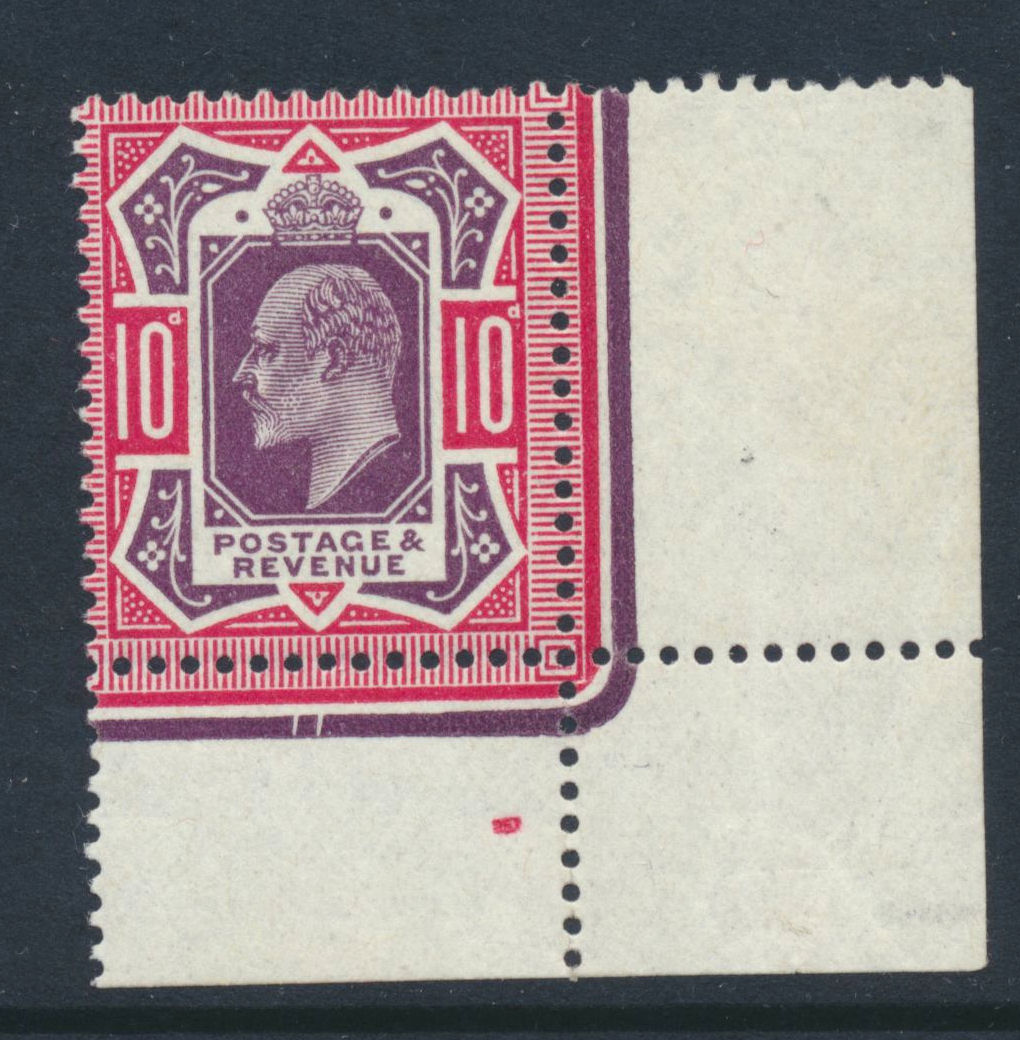 Somerset House 10d dull reddish purple and carmine u/m, a lovely corner marginal example with date cuts.